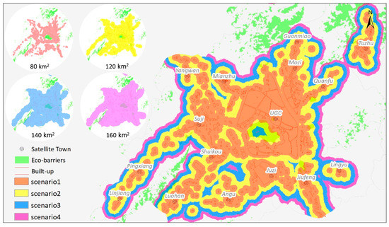 According to the urban planning of LS, the scale of constructed land in the central district will be controlled within 100 km2 and 140 km2 in 2020 and 2030, respectively. With the expansion of the urban scale, the connectivity between the central district and the surrounding area will be more convenient. However, the green space, especially garden plots and grassland will be compressed. Considering this, we analyzed the connectivity of the urban–rural areas and the protection of green space in different urban scale scenarios. Therefore, four scenarios were designed to refer to the scale of urban planning of LS: 80 km2 (scenario 1), 100 km2 (scenario 2), 140 km2 (scenario 3), and 160 km2 (scenario 4). Scale simulations of UE in the different scenarios were performed, and the results are shown in Figure 11. All of the satellite towns, except for Tuzhu and Lingyun, interconnected in scenario 2. This indicates a high connectivity between the central district and satellite towns under the 120 km2 urban scale. In addition, the size of the green space is suitable. In scenario 3, the important satellite towns (e.g., Mianzhu, Suji, Juzi and Mouzi), are incorporated into the central district, and the urban scale reaches 140 km2. As a result of the urban expansion, some green space and basic farmland are occupied and converted into constructed land. With the urban scale continuing to expand, in scenario 4, the urban scale reaches 160 km2 and the urbanization rate is 86.1%. However, most of the green space, basic farmland, and ecologically sensitive areas are occupied by constructed land. Such a development model is unsustainable and not recommended. Following comprehensive analyses of the above four scenarios, the most suitable scale is 132 km2 for LS. In this scale, LS not only has high connectivity between urban and rural areas, but fewer green spaces, basic farmland areas, and nature reserves become occupied.