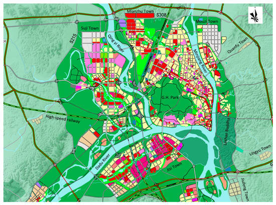 We established the ESRF to evaluate the resistance of UE, and then used the LMCR model to simulate the direction and scale of UE. The results showed that the directions of Mianzhu, Guanmiao, Suji and Juzi were the most suitable for expansion, and they had lower resistance from other landscape units. In 2030, some important satellite towns will be incorporated into the central district with through urban expansion. We discussed the simulation results with experts of the LS Urban Planning Bureau (LUPB) for the sake of validating the results and the accuracy of the LMCR model. Fortunately, they gave their support and we obtained the 2017 version of the urban planning map (Figure 12) of LS, which was approved by the government and well praised by the public. The urban development plan from 2018 to 2030 was elaborated in this version, including the urban development mode, direction, and scale of UE and ecological protection measures. The ecological red line (ecological barriers) was clearly elaborated in the ecological protection method, including the protection of basic farmland, water sources, and green space, which were the ecological barriers in this case study. From the planning map, it was obvious that the directions of UE were northward, westward, and southward. Moreover, many garden plots and parks were preserved along the river. This was consistent with the simulation results of UE in this case study (Figure 10). In scenario 3 (Figure 11), the simulation results were compared with the urban planning map. It can be seen that the scale of UE was consistent with the planning map. For validation, we compared the area of constructed land in scenario 3 and the planning area of 2030 by calculating the ratio of area; the ratio of calculating was 0.9817. This ratio showed that the error between the scale of simulation and planning was 1.83%. Moreover, Suji, Mianzhu, Juzi, and Mouzi were incorporated into the central district in 2030.