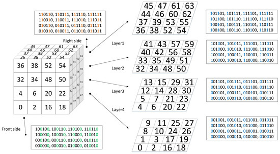Based on our previous work, we extended the two-dimensional global subdivision framework into a third spatial dimension: the elevation dimension. The division of the elevation dimension is directly adopted through a dichotomy. The entire range over which the elevation dimension is divided spans from the geocentric position to 50,000 km above sea level. In this way, this GeoSOT-3D grid system not only possesses global multidimensional octree hierarchical characteristics but also maintains consistency with different types of applications. With an octree-like structure, the GeoSOT-3D coding exhibits three-dimensional components. The node index that branches out from the top level is determined by a formula that uses bits to characterize the longitude, latitude, and altitude within the former node’s space. The digit is either 0 or 1 at each level in one dimension; therefore, a digit ranging in value from 0 to 7 can be applied to represent one code at each level by occupying 3 bits. The next (lower) level inherits the digit from the former digit, and an identical formulation is repeated. In this research, if gridA is spatially contained by gridB, we claimed gridA as the parent grid and gridB as the child grid. The Level-2 GeoSOT-3D grid system is illustrated in Figure 1. To better explain the grid code structure, we did not present the actual three-dimensional forms. There are 64 three-dimensional grids (23*23 = 64), and the corresponding codes are marked on the regular cubic faces, which are also shown on the four cross-section planes. The corresponding binary codes were listed for the front side, the right side, and the four layers for reference. The Z-order coding scheme maps multidimensional data into one dimension while preserving the locality of the original data. In each code, every bit belongs to a certain dimension and has dichotomous implications. To elaborate, we highlighted the binary bit with the same values in one group to demonstrate that the data of a certain side or layer are determined only by specific binary bits.