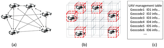 Traditional calculation method and spatial database-based query method for unmanned aerial vehicle (UAV) collision detection. Traditional collision detection methods depend on pairwise calculations based on three-dimensional coordinates (a). The calculation complexity increases rapidly as the number of UAVs increases. The grid-based method simplifies the collision detection procedure as a comparison process for regular-sized spatial grids (b). The grid-based method can be further advanced with a UAV management table (c). In the table, the GeoSOT-3D code is set as the primary key, and the collision can be detected by a straightforward query.