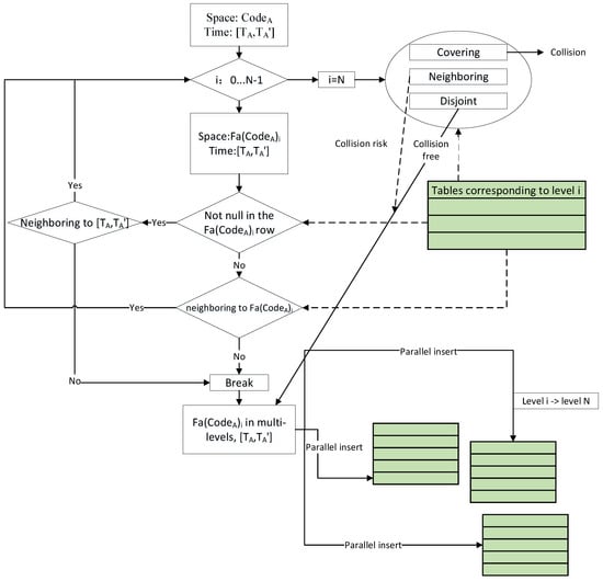 The spatiotemporal collision detection process for multiple grids is shown in Figure 5. We assumed that several spatiotemporal grids are present; each grid corresponds to a spatial grid code CodeA and time interval [TA,TA’], and the lowest-level space code is set as N. The collection of the spatiotemporal grid is recorded as {CodeA, [TA,TA’]}. For each individual grid, we obtain the parent grid codes on levels from 0 to N-1, and the time records are also retained. Thus, several spatial grid codes can be stored at one level, and one spatial grid code may have several corresponding time interval records. The level variable i loops from level 0 to level N-1. For all spatial grid codes at level i with the corresponding time interval [TA,TA’], if it is null, the condition for the data insert operation is satisfied; otherwise, the collision conditions should be examined individually according to the previous formula, and the collision-free grids with their child grid codes should be removed. When the variable i reaches N, we should make one-to-one judgments with each existing grid code. If any of them intersect with CodeA, the result is a collision. If it is an adjacent relationship, there is a risk of collision. If it is a disjoint relationship, there is no risk. When the last subprocesses all satisfy the insert conditions, the multilevel data can be inserted into the multilevel data tables in parallel.