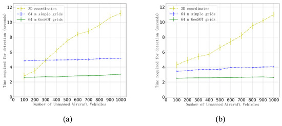 Figure 8 displays the results of another simulated UAV formation flight. Different from the previous experiments, a 1 km × 1 km × 1 km obstacle was placed at the center of the airspace, and the experimental results are shown in subfigure (a). In addition, 100 obstacles of the same size as the UAVs were placed within the airspace, and the experimental results are shown in subfigure (b). We find that, when the quantity of UAVs was less than 300, the three methods exhibited little difference; however, as the quantity of UAVs increased, the computation times of the two grid methods were significantly better than that of the method based on three-dimensional coordinates. Moreover, the method based on 64 m grids was superior to that based on basic 64 m grids. The general trends were similar to those observed in the obstacle-free experiment, and the time consumed for collision detection was reduced by approximately 70–80% with the proposed method.