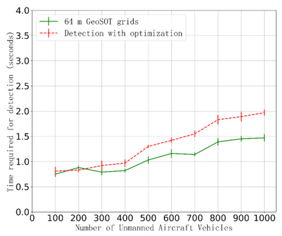 Time required for detection with different GeoSOT-3D grid sizes. The three selected GeoSOT-3D grid sizes are 128 m, 64 m, and 32 m, which correspond to levels 19, 20, and 21, respectively.
