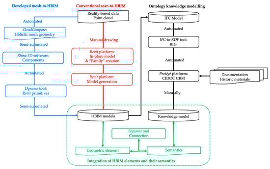Workflows of the HBIM modeling and the integration with ontological knowledge.