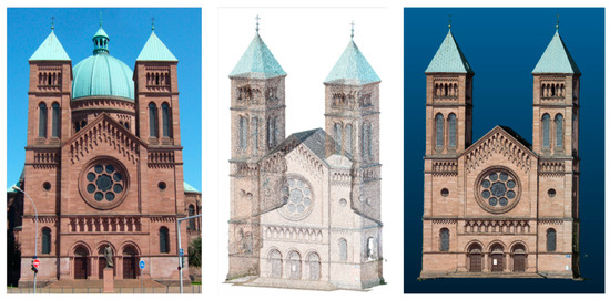 The St-Pierre-le-Jeune Church, Strasbourg, France, was built between 1889 and 1893 and designed by German architects Skjold Neckelmann and August Hartel. The church is in the neo-Romanesque style, with its imposing 50 m dome inside and a diameter close to 20 m at the base. Our previous project [59,60] took in total 2755 UAV images and around 200 terrestrial images for the exterior and generated the point clouds based on dense matching. The meshing was then performed on the merged point cloud using the Poisson method (level of Octree 13). Finally, the textures from all images were projected on the unified 3D mesh. The final 3D model is a holistic geometric model in mesh surface format, which can be viewed through the following link: https://skfb.ly/PtQF [60]. The study area in this paper is the front part of the church, including the main façade and two square belfries (Figure 2).