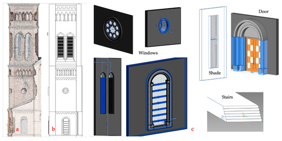 (a) The point clouds imported in BIM platform, (b) the HBIM structures created by reverse design, and (c) some typical “classes” composing the church on the reference of the point cloud