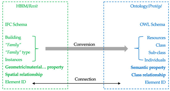 Both HBIM and ontology utilize the object-oriented approach consisting of a primitive system to describe the characteristics of built heritage elements as well as their relationships. They represent heritage through a synthesis of three main concepts: “Classes”, “properties”, and “rules/relationships”. A “class” is a group of elements with a standard set of parameters and similar representation, which is the base for the HBIM modeling, ontology semantics richness, and information fusion. That is, HBIM and ontology rely on corresponding “classes” and entities with different types of properties and relationships.