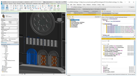 (ii) Ontological knowledge: The “classes” and entities are converted from the HBIM elements with unique identifiers. The knowledge related to the historic building and its sub-elements can be enriched by ontology properties and relationship. The ontological knowledge is finally connected with HBIM elements in the BIM environment.