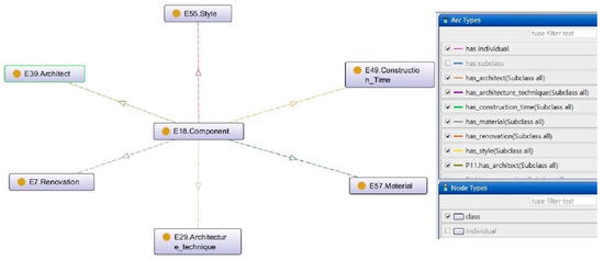 Protégé, an open resource platform to construct domain models and knowledge-based applications with ontologies [62], is adopted to enrich the properties and relationships for the HBIM entities. In the cultural heritage context, the International Committee for Documentation Conceptual Reference Model (CIDOC CRM) provides ISO standardized definitions as well as a leading ontological reference for describing the implicit and explicit concepts and relationships about historic buildings [46]. To align our work with a bounder research community effort, we build the ontology model in the context of CIDOC CRM (Figure 7). Data properties in ontology represent attributes and object properties represent the relationship between different classes (Figure 8).