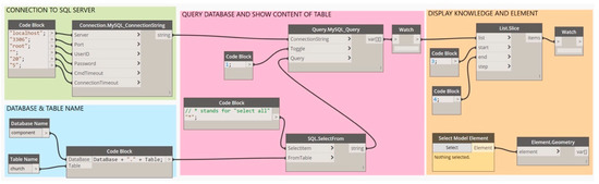 The drawbacks of the ontology analysis come to the requiring of long SPARQL queries to extract relevant information [63] and the accessing of the HBIM element. Thus, a correspondence between the HBIM element and ontology semantics is built in the BIM environment. Revit Dynamo provides the interactive interface in the study, where users can browse the semantic information reserved in the ontology database and the 3D model in BIM platform at the same time (Figure 9).