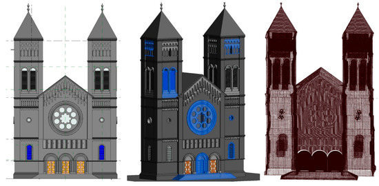 The obtained HBIM model (Figure 10 left) using point clouds is a geometric model with parameters and semantics. Users can alter the settings in the Revit interface or Dynamo nodes. That is, we can change the shape of the HBIM elements, and the geometric accuracy of the model extremely depends on the manual drawing works. The level of detail (LoD) of the HBIM model relies on the design of “classes” and entities, in which the more parameters and higher accurate geometry are manually created, the higher LoD is obtained. The parametric HBIM model corresponds to the most-used LoD3 in CityGML or LoD300 in IFC, which contains the full exterior of an architectural model with complete wall and roof structures, doors and windows [64].