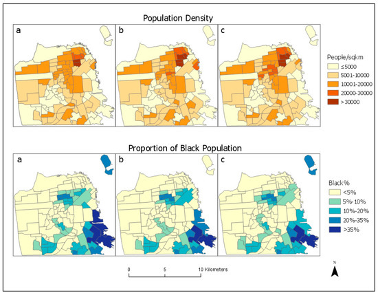We implemented the three methods: areal weighting, residential proportion, and parcel-and-census-based interpolation, and applied them to estimate population and subpopulations in San Francisco. Count variables, such as total population and black/African American population, can be estimated directly by each method. Quotient variables which are the ratio of two counts, e.g., the proportion of black/African population or the proportion of people in poverty, can also be estimated by dividing the estimated counts. Other non-count variables such as median household income cannot be estimated yet using any areal interpolation methods as far as we know. For illustration purpose, results on population and black/African American are reported in Figure 3 in the form of population density and proportion of black/African American population. Population count is the standard variable in areal interpolation. Black/African American is a subpopulation variable whose data in 2010 is available at intermediate zone level (i.e., census block). As explained previously, when data at intermediate zone level exists, there is the option of using it (Equation (4)) or not (Equation (3)). We examined both options to assess the utility of block-level decennial census data. Table 2 summarizes the accuracy of each method on each variable.
