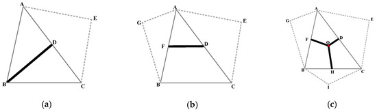 Type III triangle: There are three adjacent triangles that are the intersections of the skeleton line branches as the starting points for stretching in three directions. As shown by ΔABC in Figure 1c, the three extension directions occur at point O.
