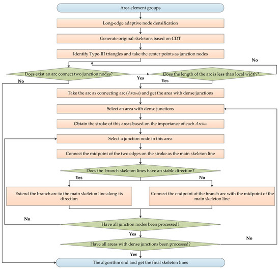 In this paper, a method for extracting skeleton lines in the areas with dense junctions considering stroke features is proposed that includes three key steps: (1) Long-edge adaptive node densification: construct fine Delaunay triangulation to avoid skeleton jitter in junction areas. (2) Identification of areas with dense junctions: identify the branch structure of the polygon as a junction unit and aggregate the junctions on the basis of local width characteristics and association relation; (3) Skeleton line optimization in the areas with dense junctions: optimize the skeleton line based on the good continuity characteristics of the stroke to get the line which fits in with human visual cognition. The detailed process diagram for our method is depicted in Figure 3.