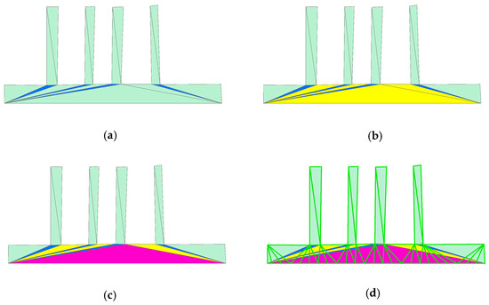 Long-edge adaptive node densification: (a) Stretched Type III triangles (blue); (b) Adjacent Type II triangle (yellow); (c) The longest edge in Type II (purple); (d) Densifying nodes on the long-edge.