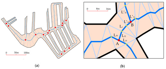 Step 3: Calculate the effective length (Lv) of the connecting arc. The length of the skeleton line between the start and end nodes of the connection arc, but excluding the inner length of the Type III triangle, is recorded as the effective length of the connection arc, as shown in Figure 5b; the effective length of the connecting arc between the start node A and the end node B is shown in Equation (3):