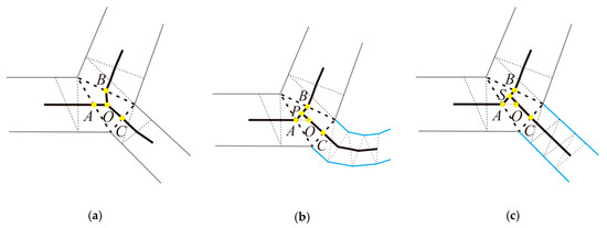 Comparison of extraction results of skeleton lines in simple junction areas: (a) Original skeleton line; (b) Skeleton line of Li [17]; (c) Skeleton line of this paper.