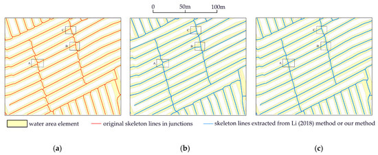 It can be seen from Figure 8 that for the simple junction areas, the method of Li et al. [17] is basically consistent with the results of the method proposed in this paper, which is able to well remove the jitters at junction areas and more accurately reflect the main structure and extension features of water elements. However, for the areas with irregular and complex junctions, as shown by the rectangles A, B, and C in Figure 8a, the method of Li et al. [17] depends on the fitting distance threshold and the direction threshold, which leads to the skeleton line having a certain degree of deviation, as shown by the rectangles A, B, and C in Figure 8b. However, the method proposed in this paper treats these areas as a whole without depending on any threshold. Therefore, the extracted skeleton line is smoother and more natural, as shown by rectangles A, B, and C in Figure 8c.