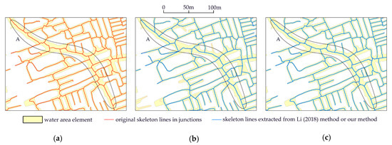 Comparison of extraction results of skeleton lines in complex junction areas: (a) Original skeleton line; (b) Skeleton line of Li [17]; (c) Skeleton line of this paper.