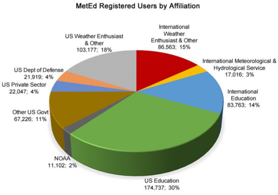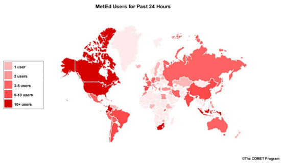 - Johnson, V.; Jeffries, R.; Byrd, G.; Schreiber-Abshire, W.; Page, E.; Muller, B.; Alberta, T. Celebrating COMET’s 25 years of providing innovative education and training. Bull. Amer. Meteor. Soc. 2015, 96, 2183–2194. [Google Scholar] [CrossRef]