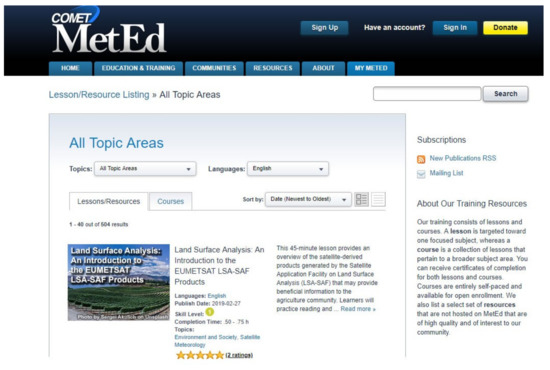 Dills, P.; Stevermer, A.; Mancus, T.; Guarente, B.; Alberta, T.; Page, E. COMET’s Education and Training for the Worldwide Meteorological Satellite User Community: Meeting Evolving Needs with Innovative Instruction. ISPRS Int. J. Geo-Inf. 2019, 8, 311. https://doi.org/10.3390/ijgi8070311