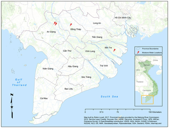 A series of dual-pronged in-situ soil moisture meters were installed throughout the Mekong River Delta (MRD) in strategic locations to validate the satellite data (see Figure 2). The meters were installed in December 2016 and then removed in April 2017 to capture the dry season growing period. The meters were installed in the three major soil types (and coincidentally three provinces: An Giang, Dong Thap, and Ben Tre) where rice is grown in the dry season to capture how the SAR data may be effected by soil type [25,26], and to replicate data acquisition in case of retrieval failures. In each province, data collection included moisture meters in a known AWD field and a non-AWD field with one replication per site. In total, there were 12 meters installed, four per soil type. Test plots were named sequentially from west to east, one through 12. The moisture meter locations are shown below in Figure 2. The meters were installed at least 10 meters away from the edge of the rice fields to account for the edge effects of watering regimes in the AWD and non-AWD fields. The dual prongs were placed in the soil to reach an approximate depth of 15 cm below the soil surface, the ideal depth to which AWD dry-down would reach. The moisture sensors remained in place throughout the growing season, with a connecting wire extending to the remote relay apparatuses. Air and humidity gauges were also attached to the meters to track climatic conditions. Since the relay apparatuses were sensitive to flood inundation, they were firmly secured inside a weather-proof box attached to a PVC pipe deeply buried in the rice field. The weather-proof box rested at an approximately 30 cm height above the soil surface. Moisture meters and climate gauges were powered by a solar panel. The solar panel was secured to the top of the PVC pipe, shading the relay apparatus inside the weather-proof box. Soil moisture meter data was remotely relayed on an hourly basis for the five months they were installed. Calibration of the soil moisture percentage occurred throughout the soil moisture meter tenure.