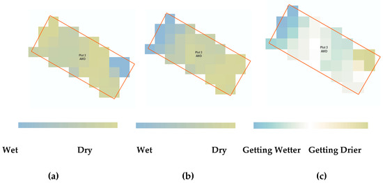 Change detection approach. (a) Initial time step wetness index (WI) scores for Test Plot 3, used in this figure as an example to illustrate the variability within each rice paddy, as well as its change over time. (b) The second time step in Test Plot 3, showing the wet and dry patterns changing over time. (c) Average change over time is shown, with bluer values illustrating a wetting trend and tan values illustrating a drying trend.