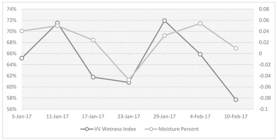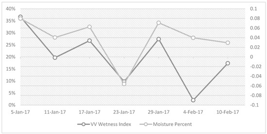 Soil moisture meter readings illustrated a clear association between VV-WI values, and soil moisture percentage taken from the test plots. The analysis used the VV band data to begin calculating the WI, similar to other WI studies [5]. An Giang is primarily alluvial, Ben Tre is saline, and Dong Thap is acid-sulfate. An Giang data most accurately reflected the WI calculations, as illustrated in Figure 4 and Figure 5. Figure 4 shows An Giang’s AWD test plot (Plot 3) in alluvial soils. The WI score and in situ soil moisture percent clearly corresponded. Figure 5 shows An Giang’s flooded test plot (Plot 5), with a similar correspondence in readings. The test plots for the Dong Thap and Ben Tre provinces did not display a clear trend.
