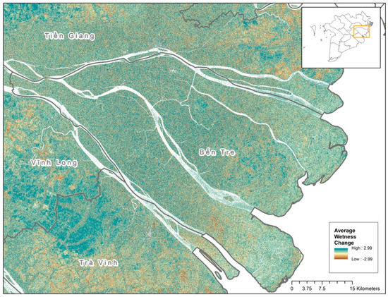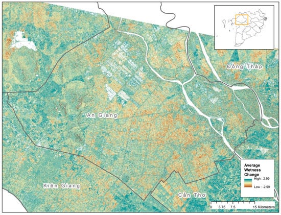 Results from the analysis illustrate the average drying trends in An Giang, Dong Thap, and Kien Giang (Figure 6 and Figure 7). However, there are some hot spots in coastal regions, such as Soc Trang, Tra Vinh, and Ben Tre. This is counterintuitive, as the household surveys, key informant interviews, and focus group discussions indicated that AWD was not often practiced in these coastal provinces.