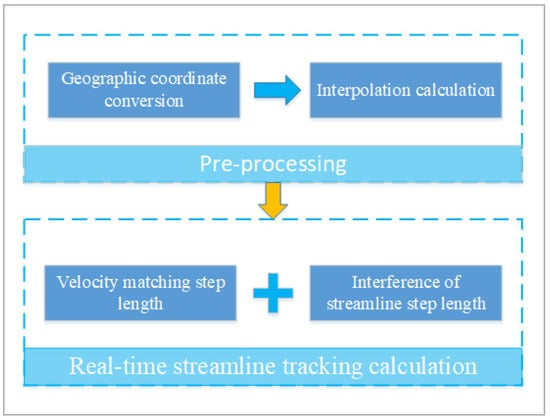 As shown in Figure 1, this algorithm is organized as follows. First, corresponding geographic coordinate points in ocean current data to the screen coordinate system, and then, performing interpolation calculations to ensure that all pixels within the screen area corresponding to the geographical extent of the data have values. Finally, using the integration algorithm that combines velocity matching and step length intervention to calculate streamline trajectories.