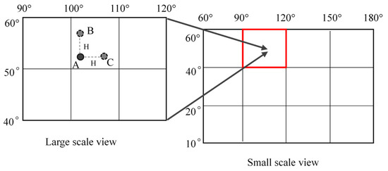 When the user scales an online map at different levels, the geographic extent displayed on the device will change accordingly, which will cause the line segment distance in the screen coordinate system corresponding to the two geographic coordinate points to change. For example, in Figure 2 there are three geographical coordinate points, A, B, and C, and when scaling the map from the large scale view to the small, the pixel intervals of line segments AB and AC will get shorter. Based on this phenomenon, a kind of multi-scale streamline step size intervention measure can be taken to optimize the multi-scale streamline expression effect.