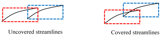 Schematic diagram of two kinds of streamline encased rectangular covering situation. The left image represents a case where the streamlines do not conflict, and it should not be excluded. The right-hand image is one that represents conflict, and it should be excluded.