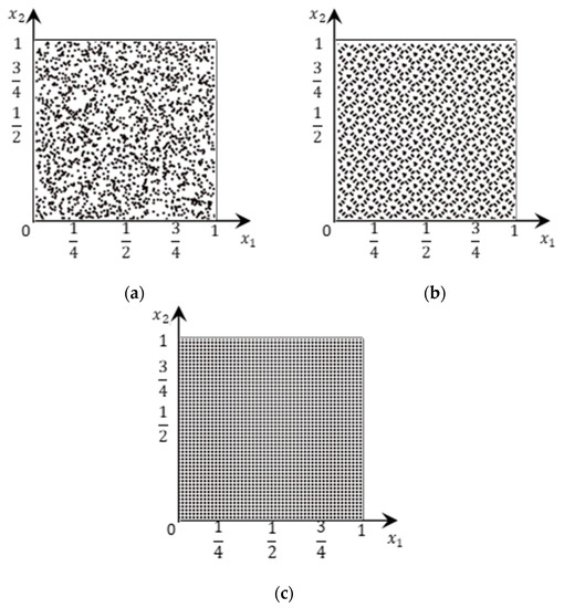 In the above formulas, denotes the Euclidean distance between and , and . Additionally, represents the maximum value of the minimum Euclidean distance in finite point set A, while stands for the uniformity of finite point set A. For this latter measure, smaller values are better [2,26].