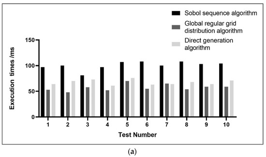 According to the results in Section 4.1 and theories in the literature [25], the global regular grid distribution algorithm is better than the direct generation algorithm and the Sobol sequence algorithm in the mathematical evaluation of uniformity.