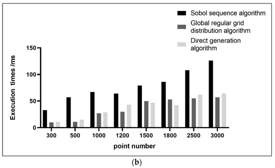 Algorithm efficiency is generally used to describe the execution time of the algorithm. In this section, this paper compares the algorithm efficiency of direct generation algorithm, Sobol sequence algorithm and global regular grid algorithm. To make the experimental data more convincing, this section carries out two groups of algorithm efficiency comparison experiments on the basis of Section 3.1.1. The two groups’ experiments are both generate points in two-dimensional space . But, the difference is that in one set of experiments, the three algorithms are respectively generate 2500 points in space , while in another, the three algorithms are respectively generate eight groups’ different numbers of points in space .