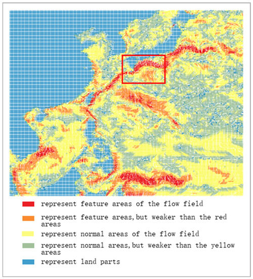 The areas where the color is red or orange are the feature areas of the flow field data. While the blue areas indicate the land parts, and the yellow areas stand for the place where the flow field features are not obvious. Besides, the red frame selected area is the place where the rendering effects are compared in Section 3.1.3.