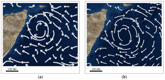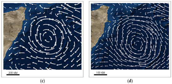 In order to intervene the multi-scale streamline step length scientifically, the step length intervention coefficient must be calculated. Before this operation, the longitude and latitude of the tracking point should be offset by the step length intervention intensity coefficient . Then, the difference in the line segment distances between the tracking point and the offset points can be figured out using Formula (3) to calculate the step length intervention coefficient. And the final data of the size and direction of the flow field can be calculated by using Formula (4).