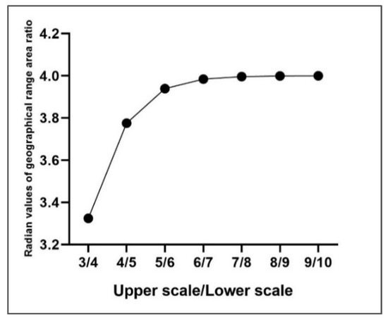 The horizontal axis represents Upper scale divided by Lower scale, and the vertical axis represents the radian values of geographical range area ratio.