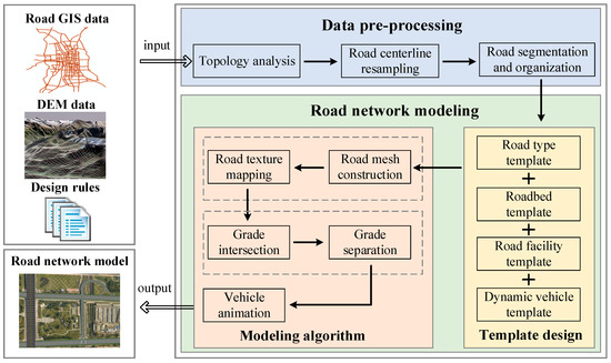 The paper is organized as follows. Section 2 presents the framework of the proposed road network model. Section 3 introduces the GIS data pre-processing. Section 4 describes the road template design and the road modeling algorithms. The experiment and discussion of the proposed method are presented in Section 5. Finally, Section 6 presents the conclusions and future work.