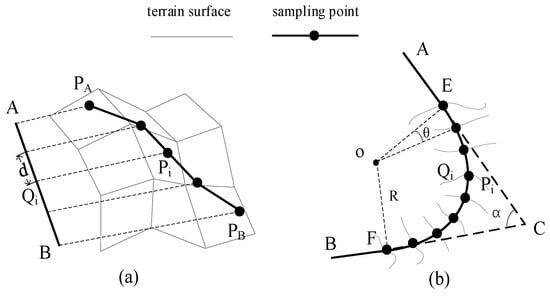(1) Take point A as the starting point and sample the straight polyline AB with a fixed distance d. The plane coordinates of the i-th sampling point can be calculated: