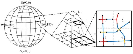 Since urban road networks are large scale and intricate, high-fidelity road network simulation that directly constructs and renders these models will inevitably lead to poor efficiency. However, a main road is usually very long and crosses several blocks along the street. Modeling the entire road is unnecessary since only parts of it will be within view in small scale situations. In a virtual globe, spatial data are usually managed and visualized using a tiled pyramid constructed with the aid of discrete global grids [27]. As a result, the road network is segmented into small parts and organized with a hierarchical block data structure before modeling.