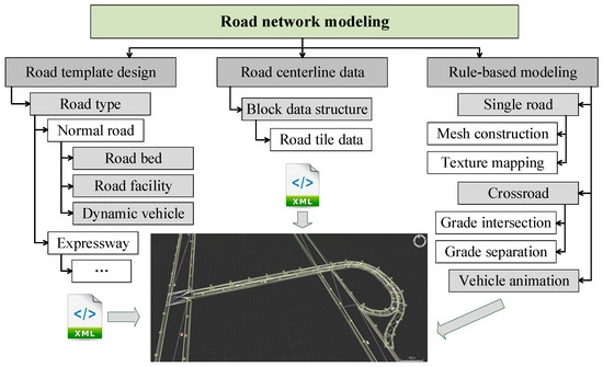 In this section, the 3D road network model is automatically constructed with the road tile data, road template and rule-based modeling algorithm (Figure 4). In order to achieve flexible road construction, different road type templates and road element templates are designed. Each template is stored as an XML file. Single road, at-grade intersections, grade-separated intersections, and vehicle animations are considered with special construction methods.