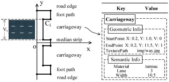The roadbed template stores the geometric and semantic information for each part. The roadbed template can be described as a set , where is the geometric coordinates, is the texture, is the V value of the texture coordinate, and is the semantic information. A local 2D coordinate system is built, origin o is the vertex of the road centerline, axis x is perpendicular to the carriageway and axis y is parallel to the carriageway. The plane coordinates of the cross-section are stored where the x value is the depth and the y value is the width. In order to achieve accurate texture mapping, the texture path and V value of the texture coordinate is stored. As the road model applies repeat texture mapping, the U value of the texture coordinate should be calculated depending on the road length. The semantic information records specific attribute information for each component, such as the lane count and lane width.