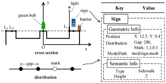 Figure 6 shows a cross-section of a typical road and distribution of the road facilities. denotes the road facility template, where is the facility model, is the position of , is the distribution of , and is the semantic information. The distribution of individual elements can be further expressed as , where is the repeat distribution distance and is the visible mask. The facility models will be flexibly laid along the road path according to the road facility template. The semantic information records specific attributes for each facility, such as its type and parameters.