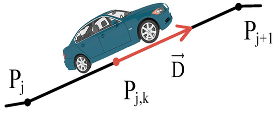 Realistic vehicle animation depends primarily on an accurate update of the direction and position of the vehicle in real time. Since the driving path is recorded in the moving vehicle template, vehicle positions and directions can be calculated as they change with time (Figure 11) using the equations shown in Equation (9). In this equation the direction of the vehicle, , is determined from the segment on which the vehicle is driving on, PjPj+1. The vehicle’ position in the next frame, Pj,k+1 is determined based on the vehicle’s speed, v, and its position in the current frame, Pj,k.