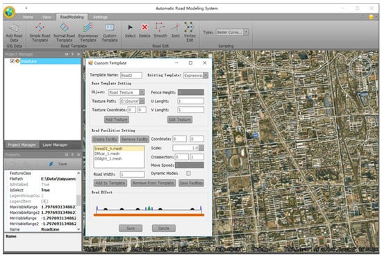 In road construction engineering, the road design rules are essential to determine every parameter of a road, including the road level, width, slope, cross section, intersection, separation and traffic facility [28]. In order to construct different types of road models flexibly, the design rules are packaged into different templates that can be reused. The road template types include the road type, roadbed, road facility and moving vehicle template.