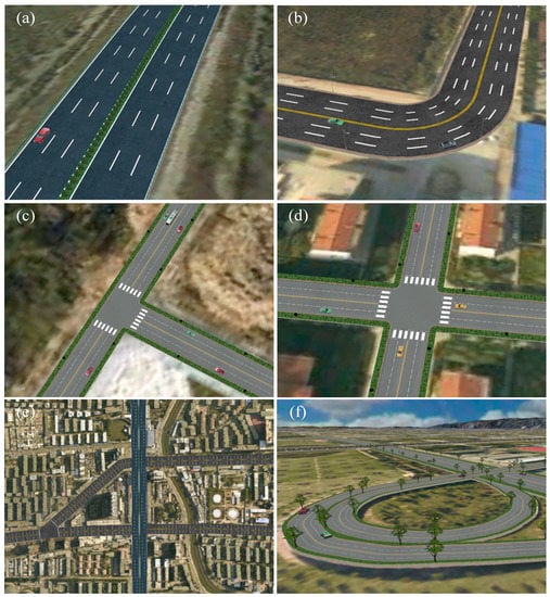 Different road modeling: (a) Straight normal road modeling; (b) simple road corner modeling; (c) three-way intersection modeling; (d) four-way intersection modeling; (e) grade separation modeling; (f) expressway ramp modeling.