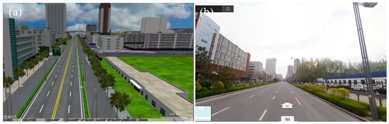 Road modeling effect comparison: (a) Our modeling effects; (b) real street view map.