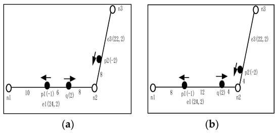 As shown in Figure 1, there are a query object, which is denoted by q, and a moving object set, which is denoted by P. Each object in the road network moves in the direction of arrow. Taking the query object q as an example, q(2) indicates that the query object q moves at speed 2 towards starting point n2 of the edge where q is located in the road network. The moving query object q requests to retrieve the nearest neighbor object in a specified period. In Figure 1a, the result of the nearest- neighbor query is p1 at timestamp 0, and the query result is changed to p2 at timestamp 2, as shown in Figure 1b. The query system must monitor the timestamp when the query result will change in the time interval [0, 2] and return the updated result. The query result consists of two-tuples, <{p1}, [t0, t1]>, <{p2}, [t1, t2]>… <{pi}, [ti-1, ti]>. {pn}, [tn-1, tn]. The query results in Figure 1 are as follows: <{p1}, [0, 10/7]> and <{p2}, [10/7, 2]>.