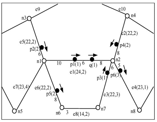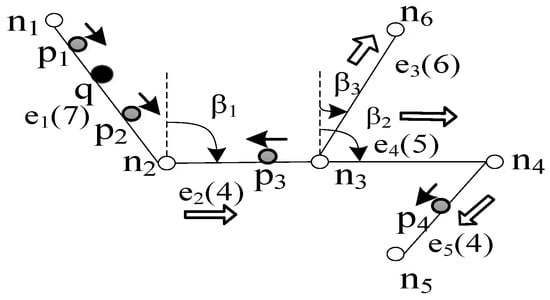 For the example in Figure 3, the global problem is clarified. In edge , represents the length of the edge and represents the speed limit of indicating the maximum speed of the moving object on . For moving object p(s), s represents the speed of object p. The query point q requests the two nearest-neighbor objects in the time interval [0, 4].